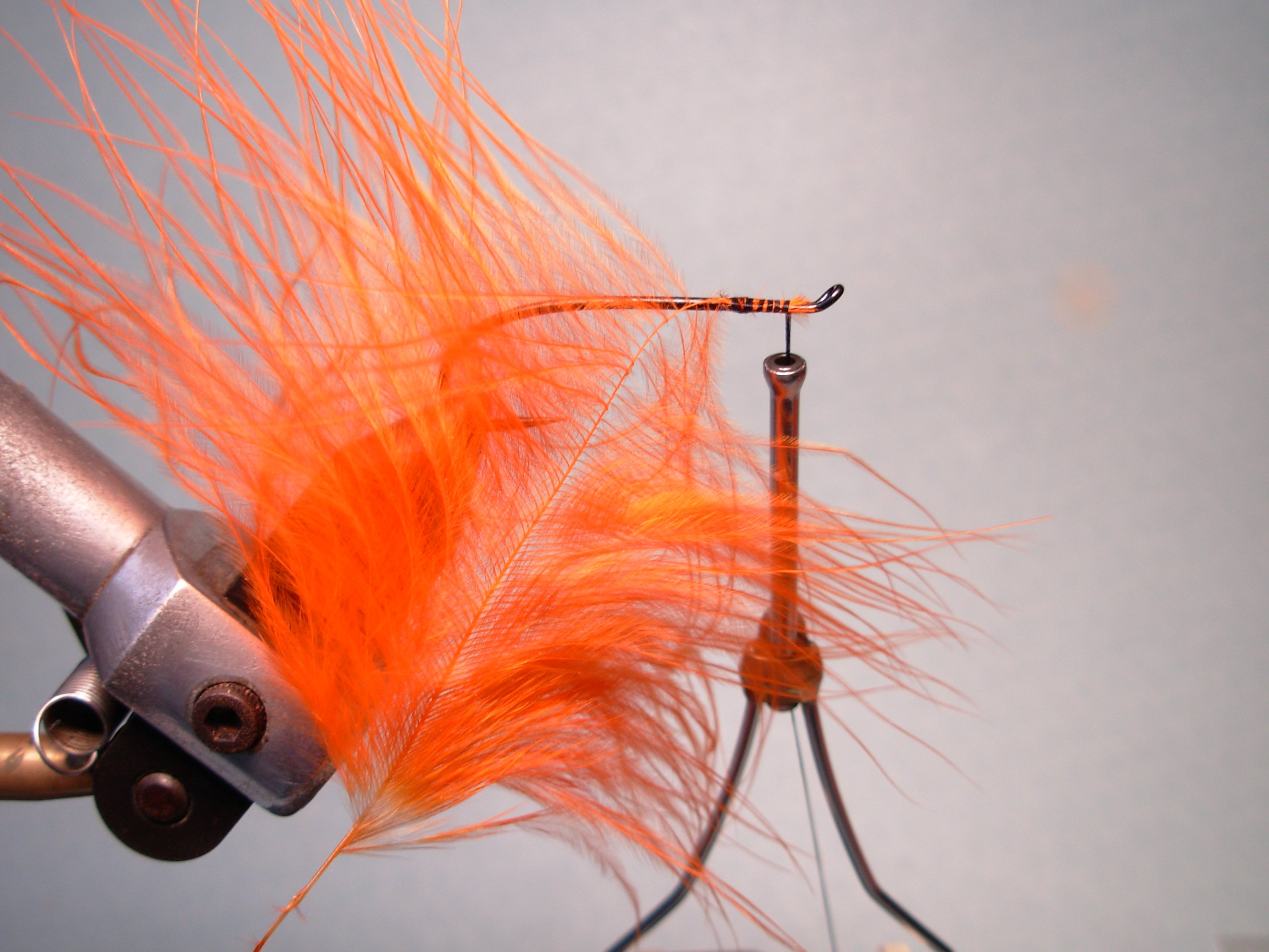 Ala: Pluma de marabou naranja enroscada a la pata del anzuelo y sobre esta otra de color rojo también enroscada.