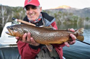 No habrían pasado más de 20 minutos cuando Esteban me indicó que un buen ejemplar estaba ingresando de la profundidad al playón. Tomamos un rumbo casi paralelo con el objetivo de acercarnos lentamente al pez. Cuando nos pusimos a tiro me indicó que lance. Hice un gran esfuerzo por serenarme y castear muy suavemente para no golpear el agua. La mosca llegó bien de manera que la trucha no se espantó, pero pasó lentamente junto al engaño ignorándolo por completo. Volví a castear y esta vez presenté el engaño a unos 3 metros por delante de la trucha. La vi acercarse lentamente y sin variar el ritmo pasó junto a la mosca. Pensé que la había perdido, y estaba a punto de levantar cuando escuché a Esteban que me decía que me mantuviese atento. El pez, repentinamente, cambió de rumbo y regresó directo a la mosca. Sentí fuertes latidos en el pecho y las sienes. A partir de ese momento la tensión y la atención de toda la tripulación estaba puesta en el indicador de pique. Lo único que miraba era esa mosca que flotaba mansamente sobre el agua. De golpe comenzó a desplazarse y hundirse lentamente. El grito de… ¡clavala! cortó el aire, al tiempo que afirmaba el pique. Apenas comenzó la corrida sentí que del otro lado de la línea estaba lo que a la postre sería mi récord de trucha arco iris: un hermoso macho de 73 cm. La alegría de haberla vencido sólo puede compararse con la emoción y el agradecimiento al verla alejarse lentamente hacia la seguridad de la profundidad de la laguna.